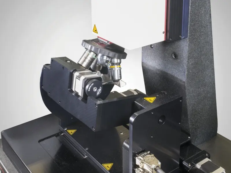 在显微测量系统中,通常要求待检验表面与透镜光轴进行正交对准。事实上,涡轮叶片的复杂几何结构会显著增加正交对准的复杂程度。对于在完全相同工件上进行的重复测试,明智地讲,这种测试只能通过 CNC 自动化测量站进行。Mahr 提供的配备 CNC 控制的倾斜/旋转装置的 MarSurf CWM 100 大幅度简化了测试。由于定位轴具有共计五度的自由度,因此几乎总是可以毫不费力地到达涡轮叶片上待测量的点—无论是叶片表面本身、叶片边缘还是冷却通道的出口。