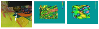 For FING-ART-PRINT, the fingerprints were first captured with a tabletop device from the MarSurf CM series. A 10x lens was used, which provided a distance of ten millimeters to the object. The lens of the 3D device has a field of view of approximately 1.6 × 1.6 millimeters. A spatial resolution of three to four micrometers and a depth resolution of one micrometer were chosen for the measurement. Taking a fingerprint of this size and with this resolution takes less than 30 seconds. "The advantage of the tabletop model is its stability. However, the fixed geometry of the setup limits the size and shape of objects and the choice of location for "fingerprints," or scans, because they must be positioned under the narrow objective lens. This also makes it difficult to retrieve a fingerprint," explains Bill Wei. In a second setup, the device, which was developed as the MarSurf CM mobile for mobile applications, was mounted on a robotic arm and moved flexibly to the objects. The advantage is that the fingerprint can be taken at almost any location; a webcam documents its exact position. The MarWin evaluation software has an image matching algorithm that uses the webcam images to help the user locate the fingerprints when positioning the object later.